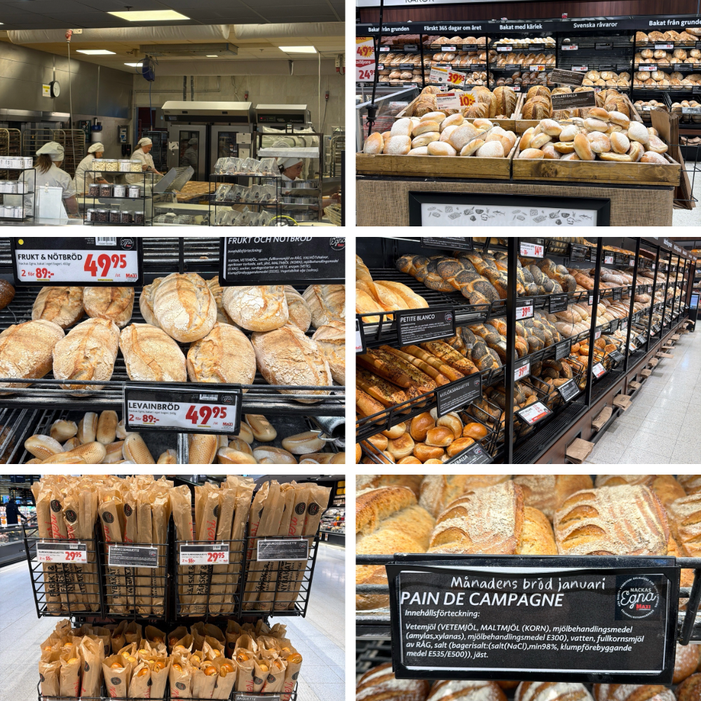 Myös leivät ovat esillä eri tavalla kuin Suomessa. Avoimet hyllyt tuoreille leiville viestivät tuoreutta. Per Ekstrand kertoo, että patongin ohella ruotsalaisen leipäosaston ehdoton hittituote, joka jokaisessa kaupassa pitää olla hyvin esillä, on levain-leipä. Toinen vastaava tuote ovat donitsit – niitä menee paljon Ekstrandin mukaan. Siksi ne vaativat myös hyvin suunnitellun sijoittelun osaston sisällä. Emma Nilsson korostaa, että erikokoiset ja -muotoiset sämpylät ovat myös vahvasti myyvä tuoteryhmä leipäosastolla.