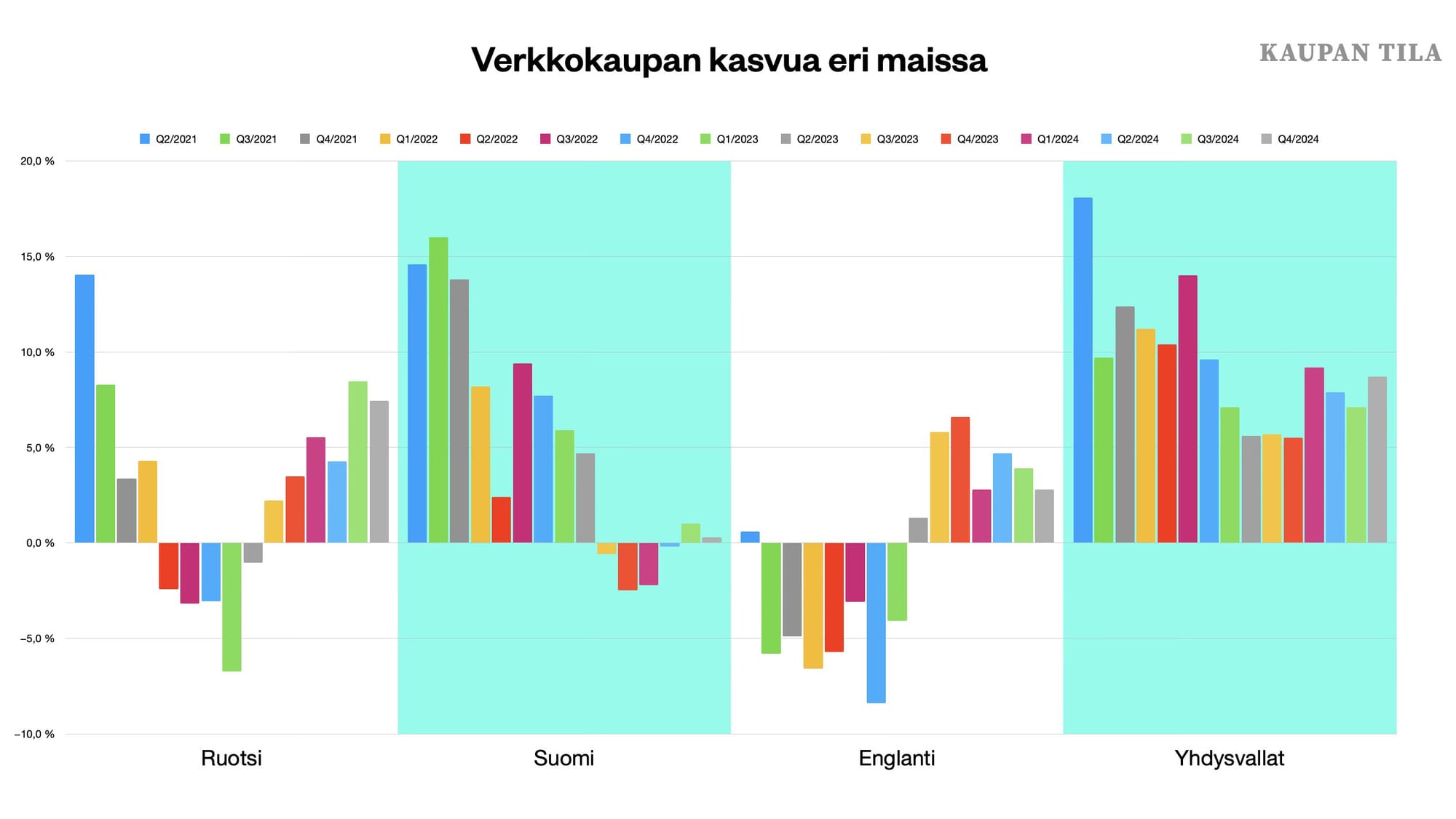 Viimeisen reilun vuoden aikana verkkokaupan kasvu on elpynyt monilla läntisillä markkinoilla. Yhdysvalloissa verkkokauppa on kasvanut yhtäjaksoisesti myrskyisien vuosien aikana. Englannissa sekä Suomessa ja Ruotsissa verkkokaupan markkinat kokivat kovempia aikoja. Jokaisella markkinalla myynnin lasku sekä siitä toipuminen ovat tapahtuneet hieman eri tahdissa.
