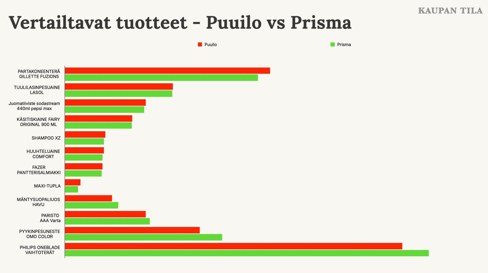 Kun tarkastellaan Puuilon ja Prisman tuotekohtaisia hintaeroja, kokonaiskuva on yllättävän tasainen. Hintaero on pieni, ja Prisma on edullisempi erityisesti päivittäistavaroissa. Partakoneenterissä Puuilo on selvästi kalliimpi, kun puolestaan Philipsin vaihtoterissä Prisma on selvästi kalliimpi. Kokonaisuutena Prisma on halvempi seitsemässä tuotteessa ja Puuilo neljässä.
