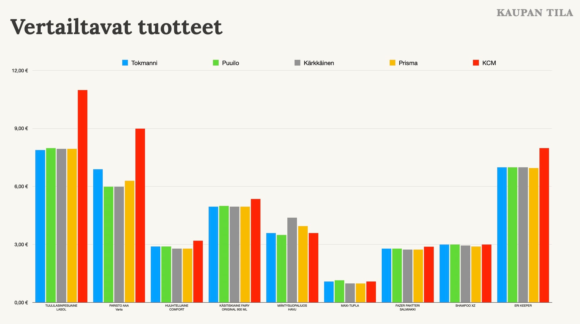 Puuilo jatkaa edullisimpana, noin kolmen euron kokonaiserolla seuraavaan kilpailijaan. Keskiryhmässä Prisman, Kärkkäisen ja Tokmannin yhteissummat mahtuvat tiukkaan, noin 2,5 euron haarukkaan, mikä kertoo hintatason olevan käytännössä hyvin lähellä toisiaan. Näiden jälkeen K-Citymarket jatkaa selvästi kalliimpana, noin 8 % Tokmannia korkeammalla tasolla.