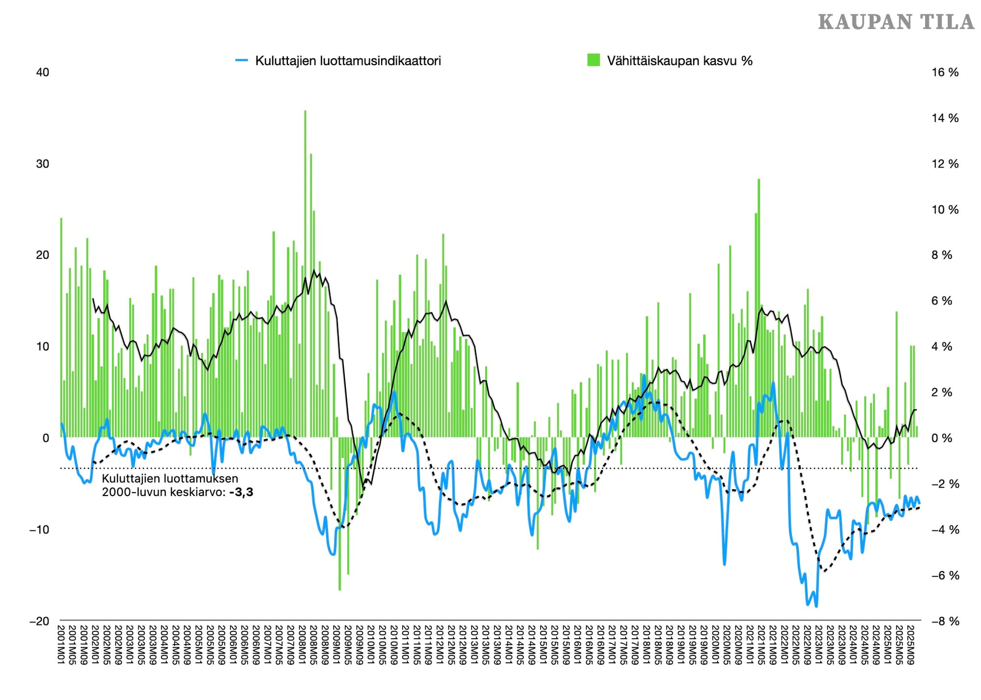 Julkisessa keskustelussa on viimeisen vuoden aikana puhuttu paljon kuluttajien luottamuksesta. Se kävi muutama vuosi sitten ennätyksellisen matalalla. Luottamuksen palautuminen on ollut varsin hidas prosessi. Paranemisesta huolimatta kuluttajan luottamus marraskuussa (-7,3) oli edelleen merkittävästi alle 2000-luvun keskiarvon (-3,3).