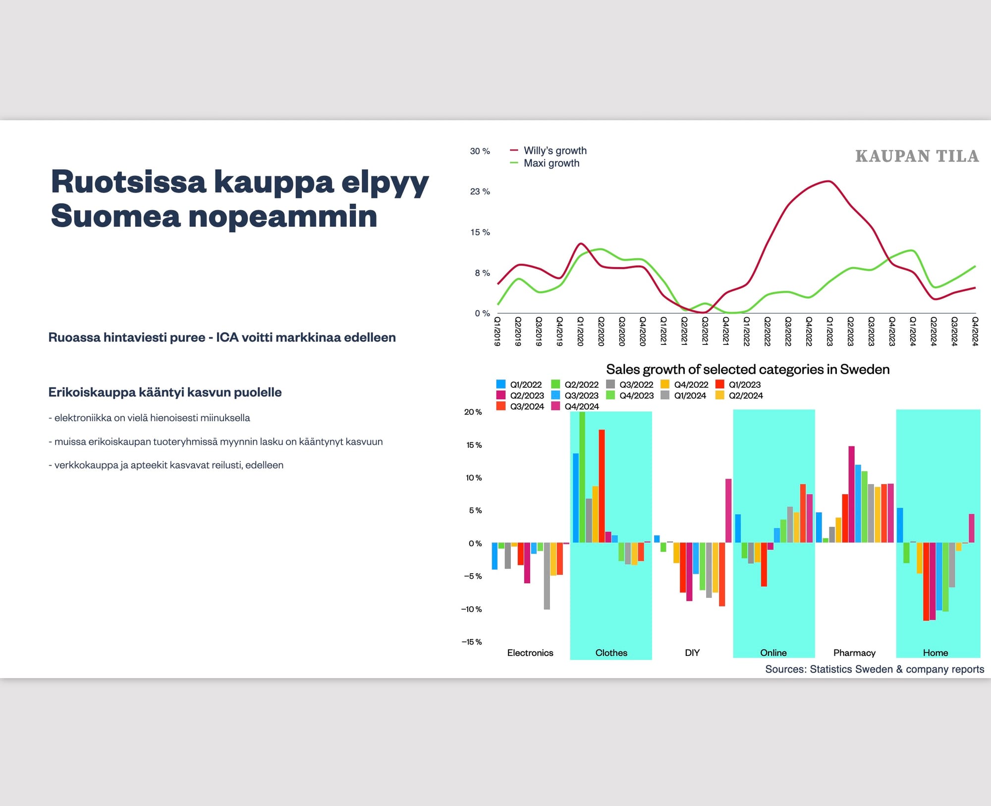 Suomessa ruokakauppa sekä tavaratalot jatkavat kasvuaan erikoiskaupan pyrkiessä kohti kasvua. Kodin elektroniikkaa lukuunottamatta erikoiskaupan toimialojen myynti laski vielä vuoden lopulla. Erikoiskaupan liiton tilastojen mukaan kotimaisen erikoiskaupan myynti olisi ponnistanut kasvun puolelle (+2 %) joulukuussa 2024. Vuoden viimeinen neljännes sekä koko vuosi olivat kuitenkin sitkeästi laskussa. Joulukuun kasvua vetivät Kello- ja jalometallikauppa, Optinen ala, Kodin elektroniikan kauppa sekä vaatekauppa.