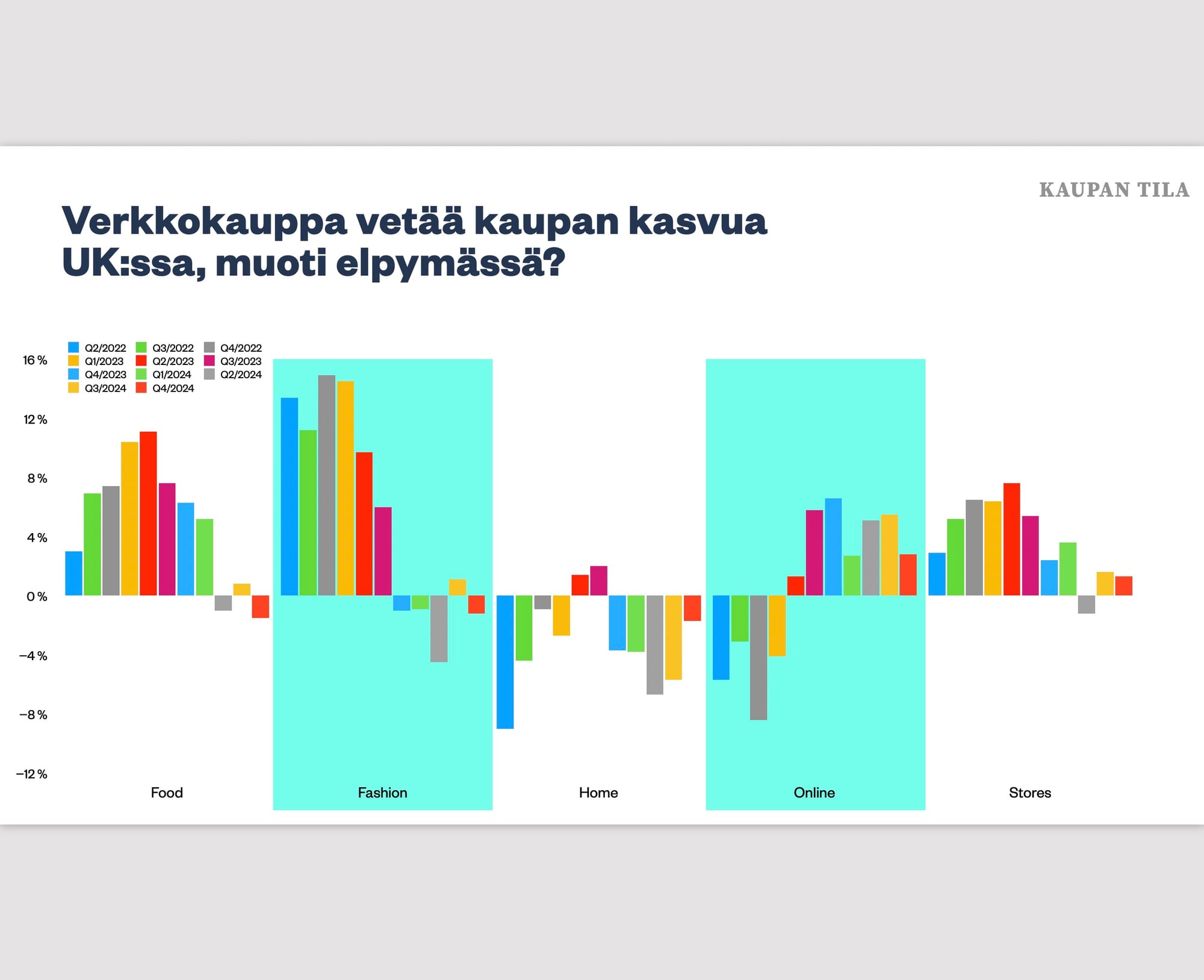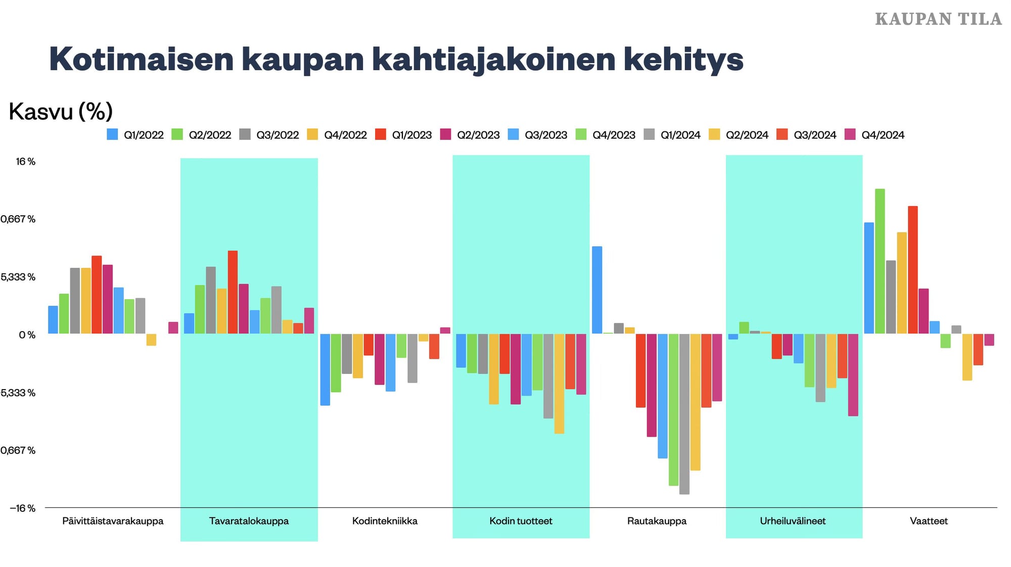 Suomessa ruokakauppa sekä tavaratalot jatkavat kasvuaan erikoiskaupan pyrkiessä kohti kasvua. Kodin elektroniikkaa lukuunottamatta erikoiskaupan toimialojen myynti laski vielä vuoden lopulla. Erikoiskaupan liiton tilastojen mukaan kotimaisen erikoiskaupan myynti olisi ponnistanut kasvun puolelle (+2 %) joulukuussa 2024. Vuoden viimeinen neljännes sekä koko vuosi olivat kuitenkin sitkeästi laskussa. Joulukuun kasvua vetivät Kello- ja jalometallikauppa, Optinen ala, Kodin elektroniikan kauppa sekä vaatekauppa.