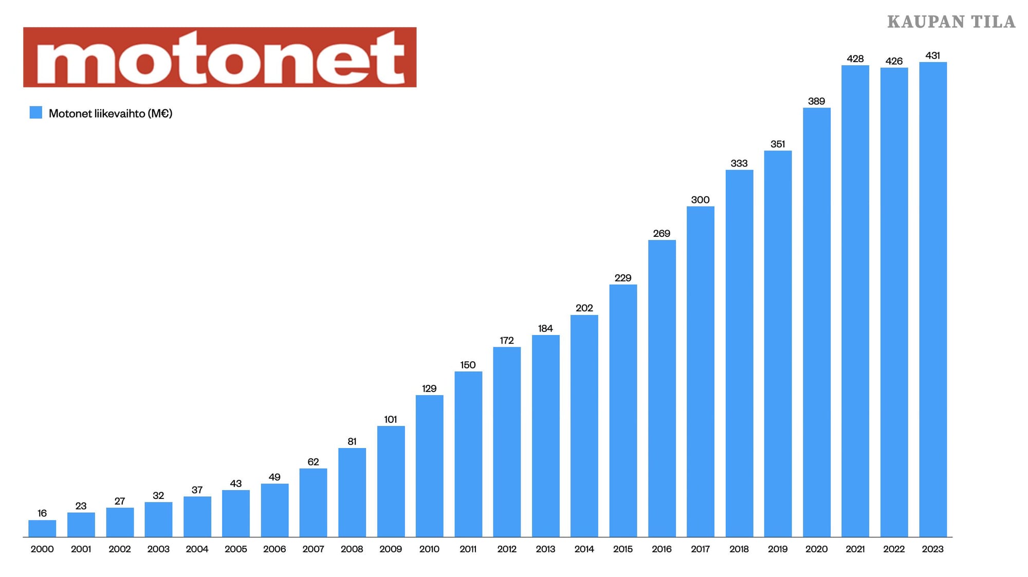 Motonet onkin reilun 30 vuoden aikana luonut vahvan aseman kotimaisen kaupan kentässä. Reilun 430 miljoonan euron liikevaihdolla yhtiö on maamme 10 suurimman kaupan ketjun joukossa. Vaikka kasvu on ollut vahvaa viimeisen 10 vuoden aikana ja yhtiö on tuplannut liikevaihtonsa, on kasvu hidastunut viime vuosina.