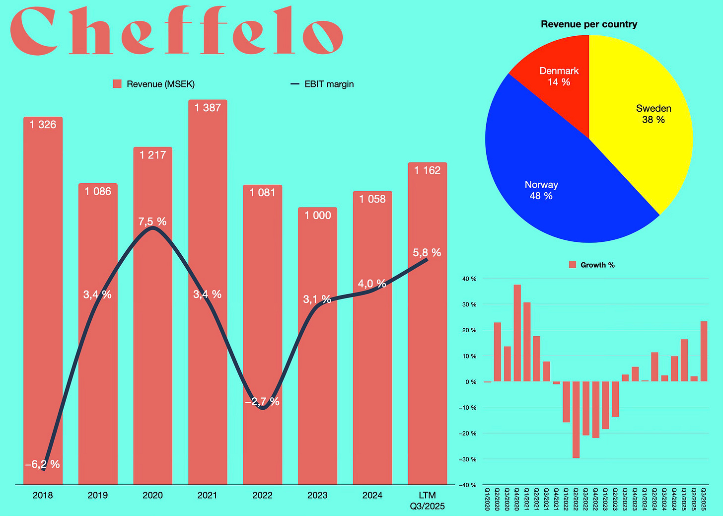 Yhtiön myynti on kasvanut jo yli kahden vuoden ajan. Loppukesän aikana se kiihdytti peräti +23,3 % tasolle. Myynti kääntyi ensin kasvuun Ruotsissa. Yhtiön suurin markkina Norja kääntyi kasvuun viime vuoden lopulla.