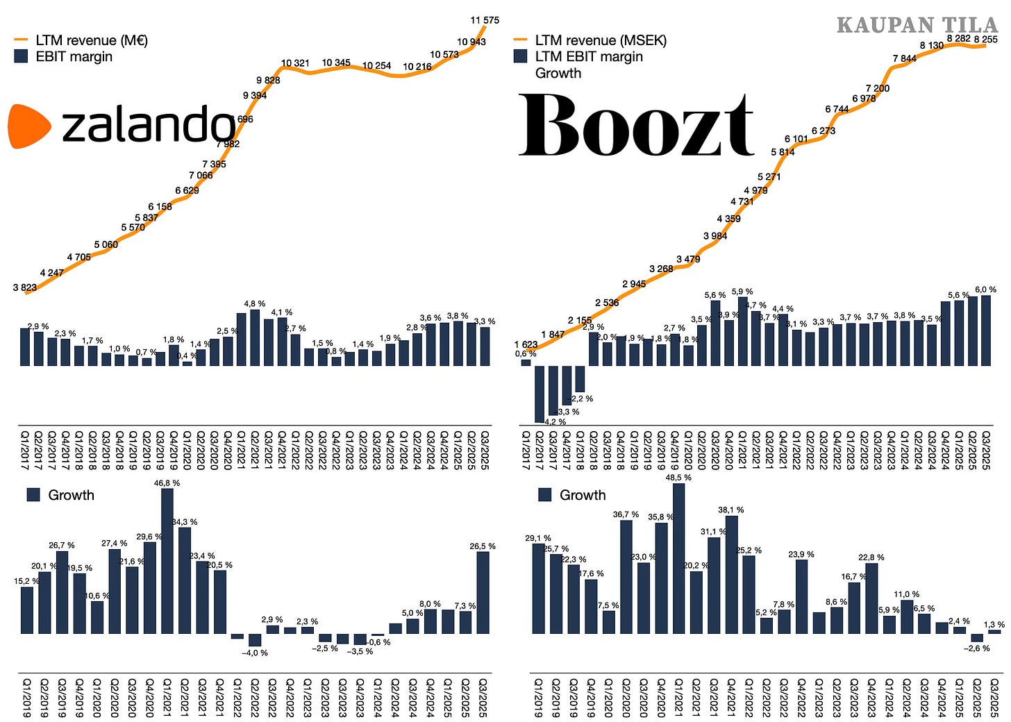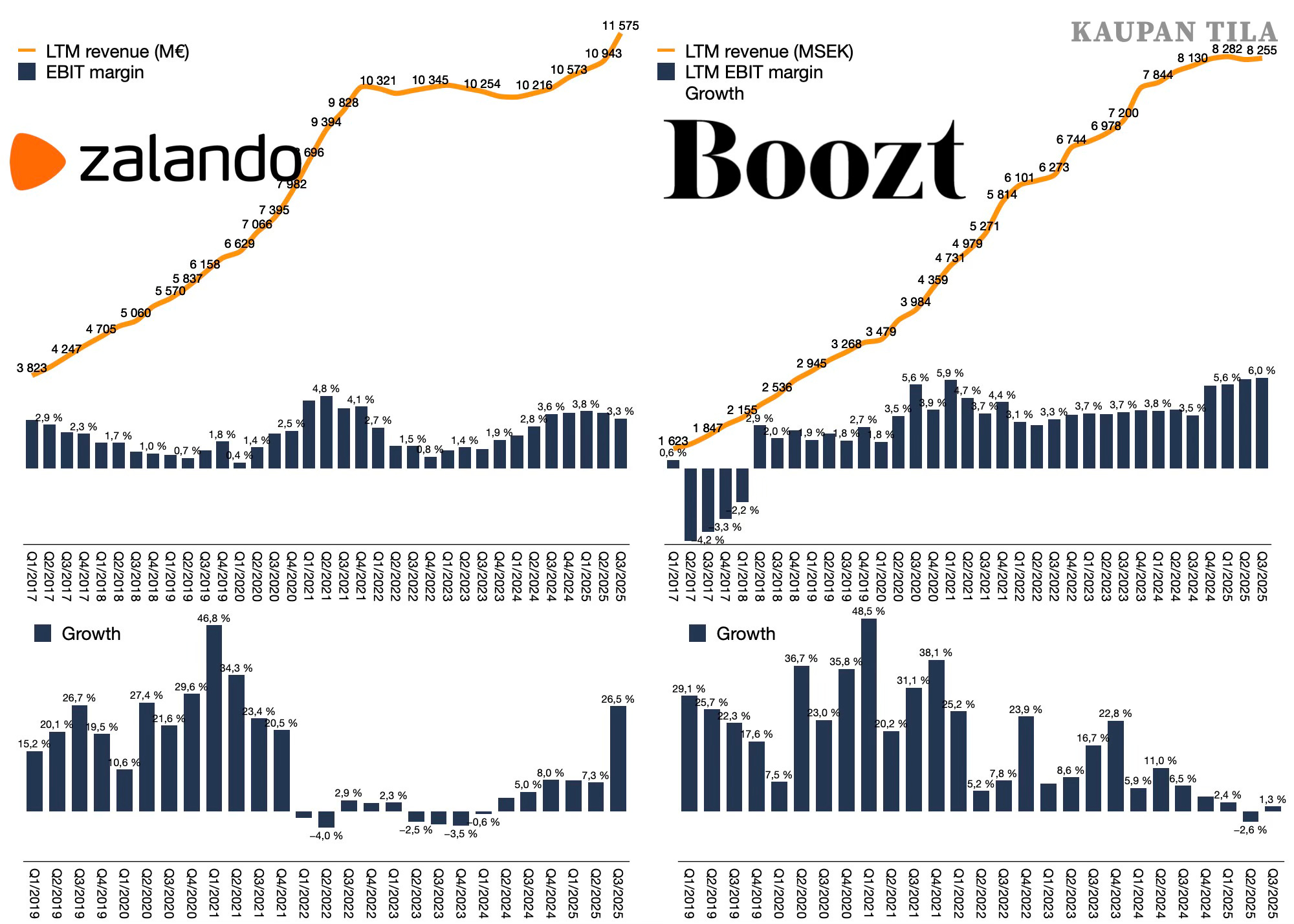 Siinä missä Zalando on noussut tasaisen kasvun uralle viimeisen reilun vuoden aikana, Boozt on sen sijaan nousemassa historiansa ensimmäisen laskuneljänneksen jäljiltä.