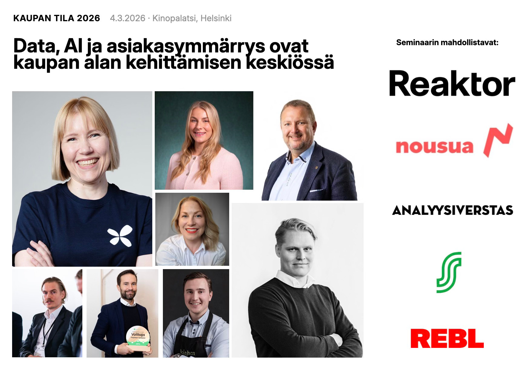 🤝 Kiitos tapahtuman mahdollistaville sponsoreille – mukana alan kovimpia toimijoita: Reaktor, Nousua, Analyysiverstas, S-ryhmä ja Rebl. 🙏