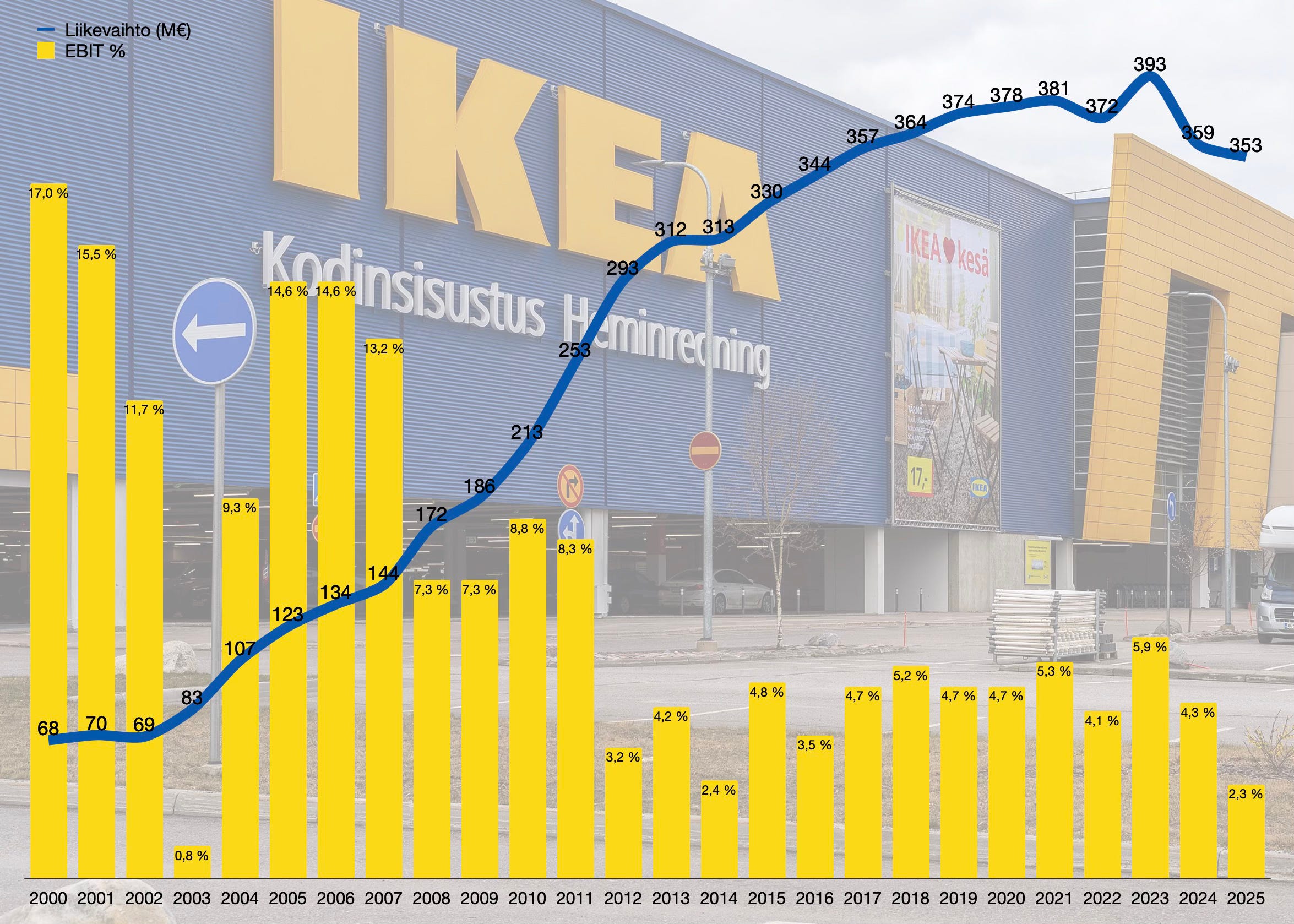 Vaikeat ajat ovat heijastuneet myös Ikean kannattavuuteen Suomessa. Yhtiön liiketulos Suomessa on enää noin kolmanneksen vuoden 2023 hieman yli 23 M€ huipputasosta. Suhteellinen liiketulos oli viime vuonna matalimmalla tasolla sitten vuoden 2003.
