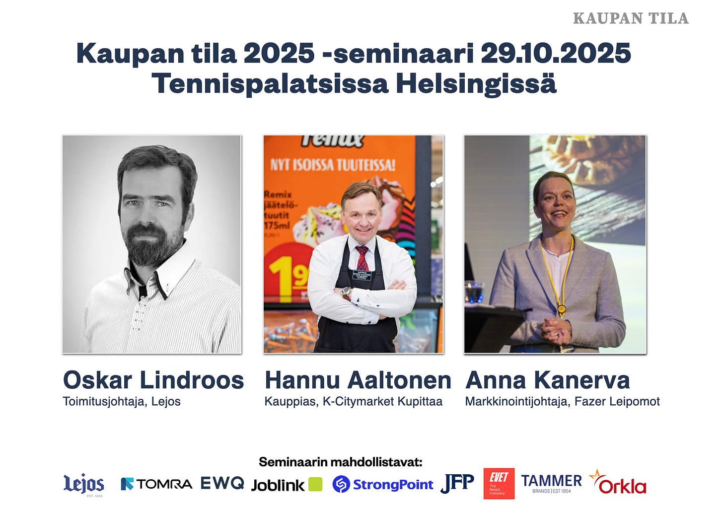 Kaupan Tila -seminaarissa keskustellaan siitä miten kauppa ja teollisuus voivat tehdä mahdollisimman hyvää yhteistyötä. Keskustelemassa ovat Lejosin toimitusjohtaja Oskar Lindroos, K-Citymarket Kupittaan kauppias Hannu Aaltonen sekä Fazer Leipomoiden markkinointijohtaja Anna Kanerva.