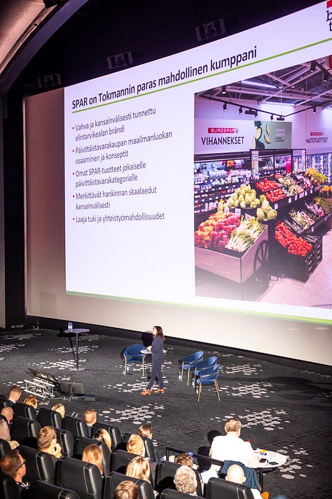 Kolmantena vuorossa oli Lidlin ostojohtaja Thomas Heinrichs, joka kertoi erityisesti siitä miten Lidl eroaa perinteisistä ruokakaupoista. Suurten kauppaketjujen puheenvuorojen kimaran kruunasi tauon jälkeen Tokmannin Maija Heimala, joka kertoi Tokmannin ja Sparin suunnitelmista laajentua kotimaiseen ruokakauppaan.