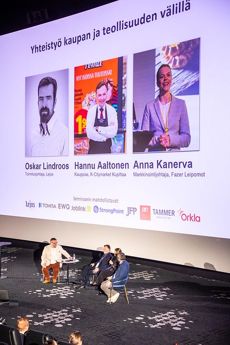 Ennen lounastaukoa oli vielä kaksi paneelikeskustelua: kaupan ja teollisuuden yhteistyöstä sekä haastajien puheenvuoro. Ensimmäisessä paneelikeskustelussa K-Citymarket Kupittaan Hannu Aaltonen, Fazer leipomoiden Anna Kanerva sekä Lejoksen Oskar Lindroos nostivat esiin esimerkkejä hyvästä yhteistyöstä. Hannu Aaltonen kannusti teollisuuden yrityksiä rohkeasti olemaan aktiivisia kauppiaiden suuntaan.