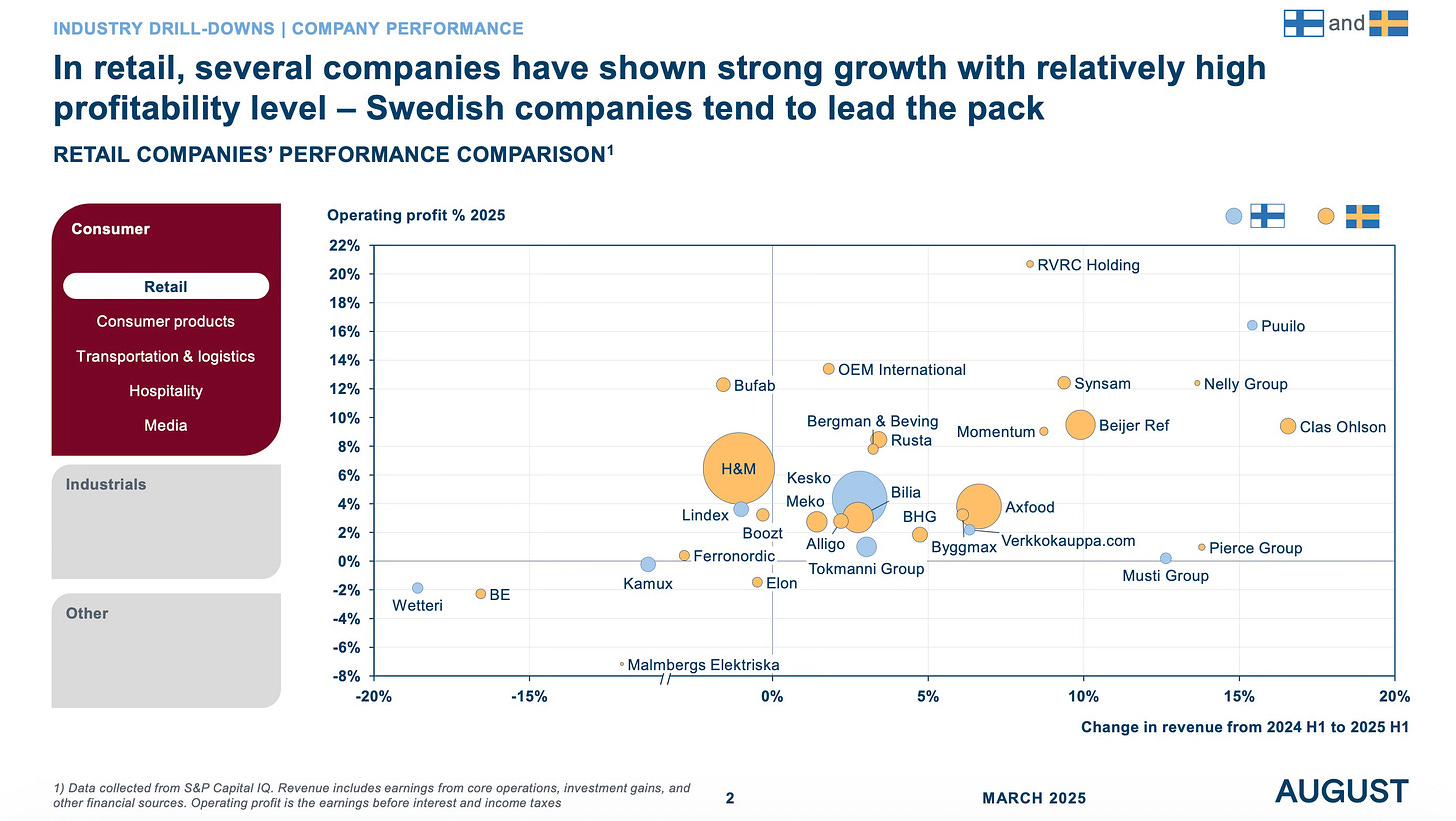 Ero markkinoiden välillä näkyy, kun katsoo vähittäiskaupan kasvua Suomessa ja Ruotsissa. Markkinat ovat kasvaneet varsin samassa tahdissa. Sillä…