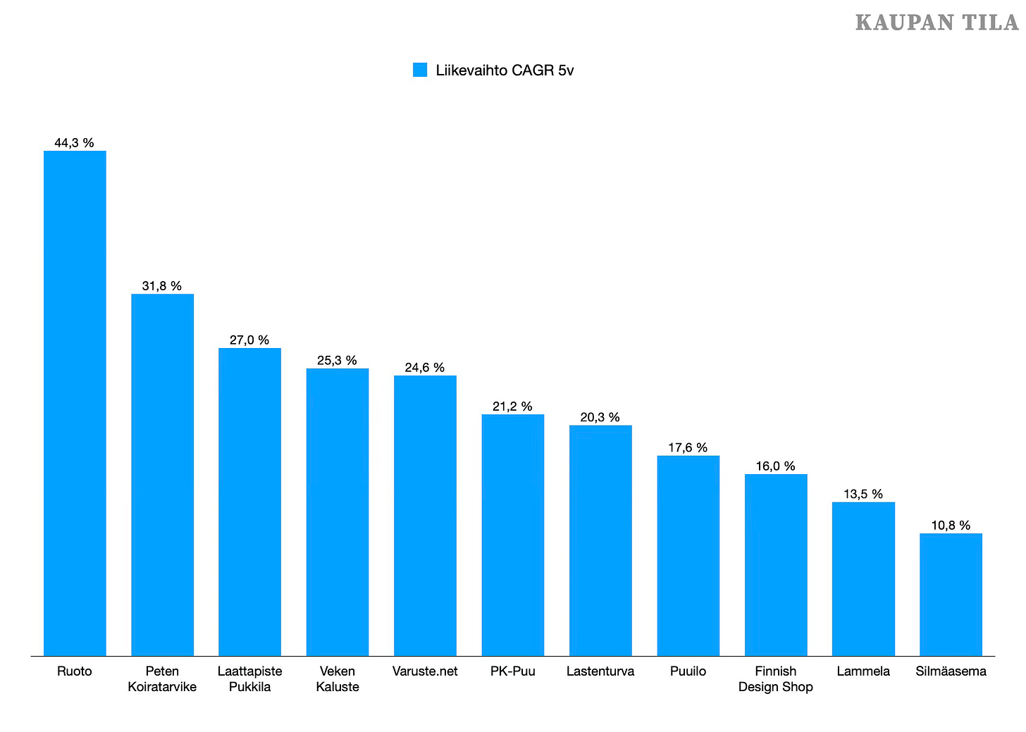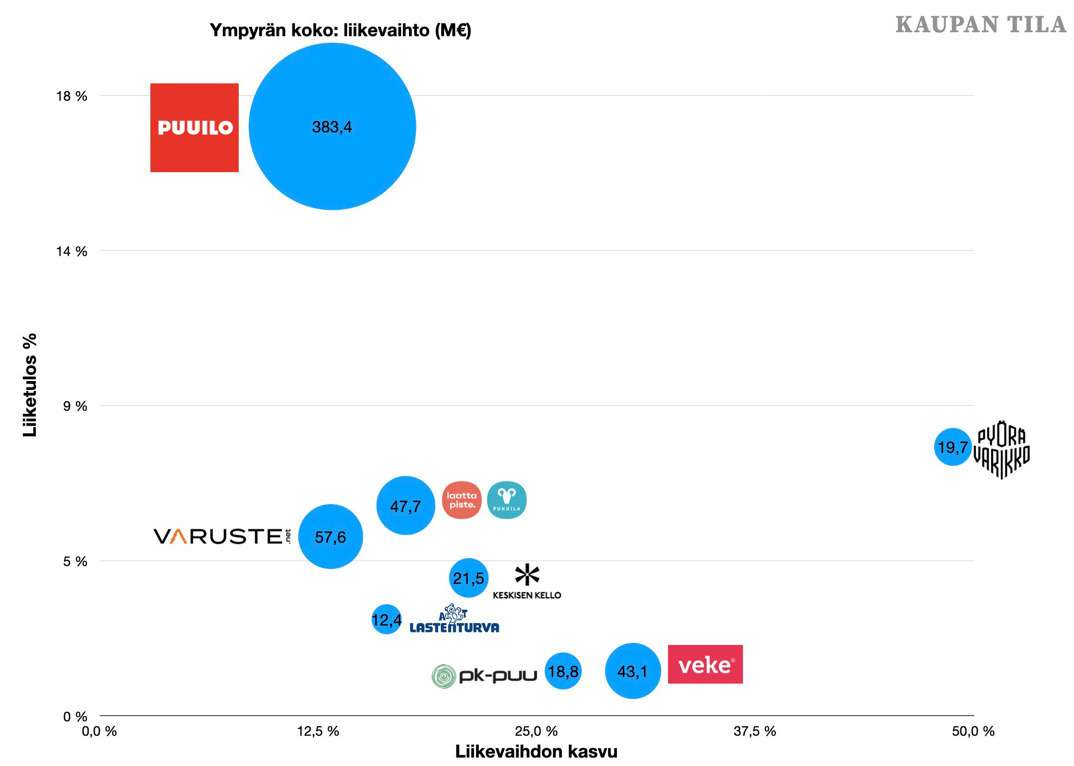Kasvun osalta viime vuonna erityisen hyvin kasvoivat Pyörävarikko, Veken Kaluste sekä PK-Puu. Kannattavuuden osalta Puuilo nousee omaan luokkaansa kasvajien joukossa huiman 17 %:n liiketuloksen ansiosta.
