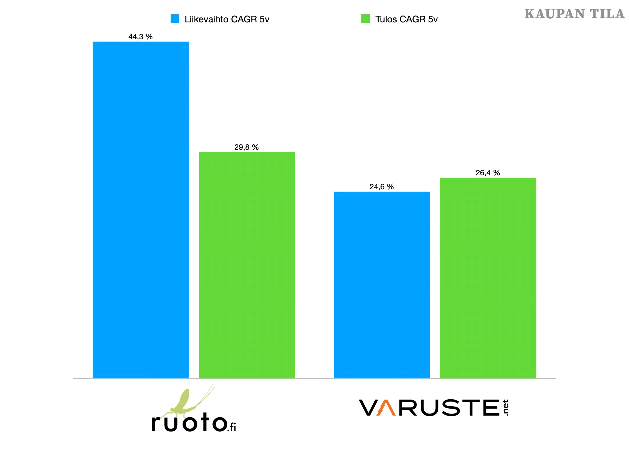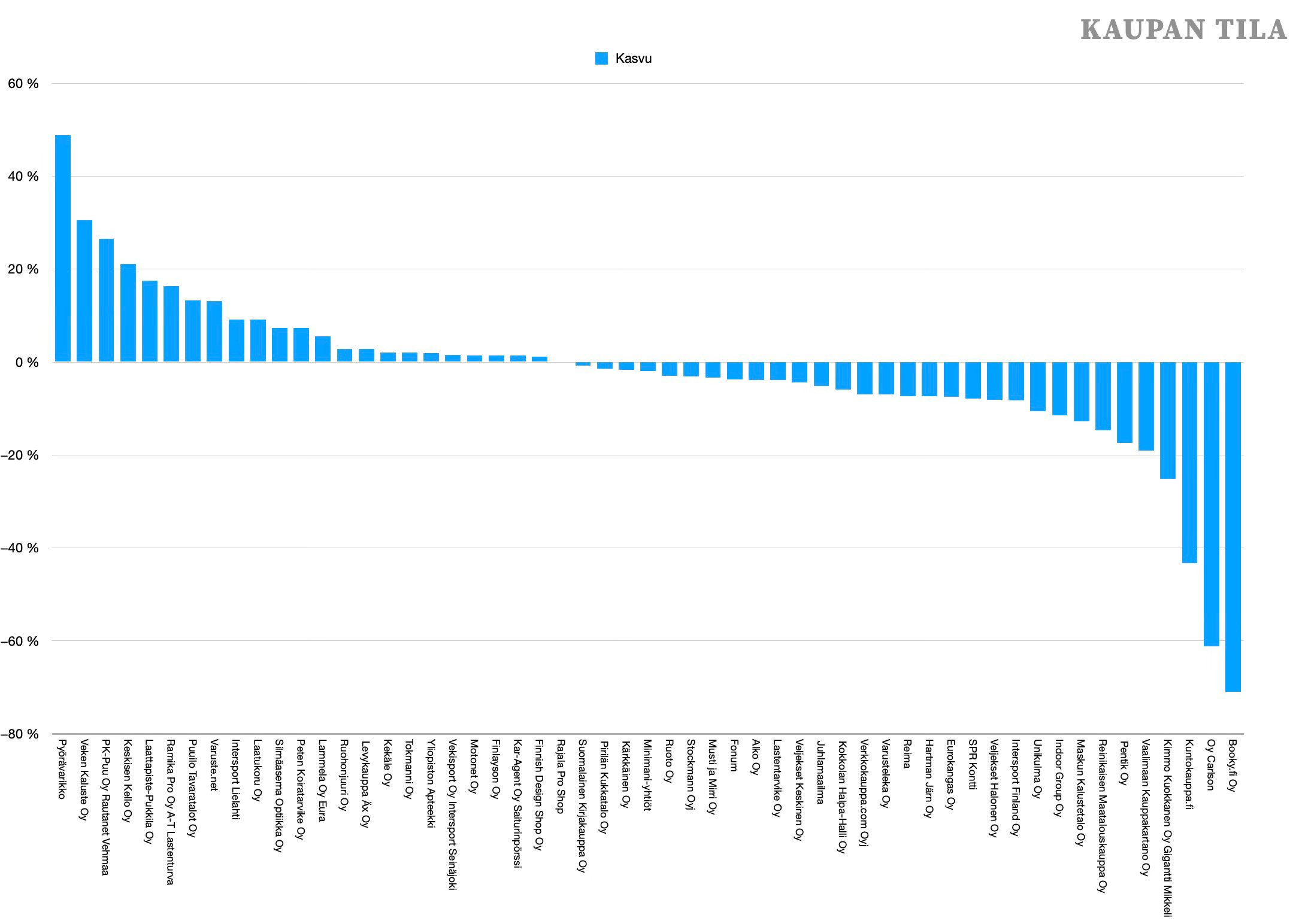 Suurempaa suhteellista kasvua molemmissa ryhmissä raportoi kalastuksen ja metsästyksen erikoisliike Ruoto. Kahdesta huippukasvajasta selvästi suurempi oli 57,6 M€:n liikevaihdolla ulkoilun erikoisliike Varuste.net (Ruodon liikevaihto oli 24,5 M€).