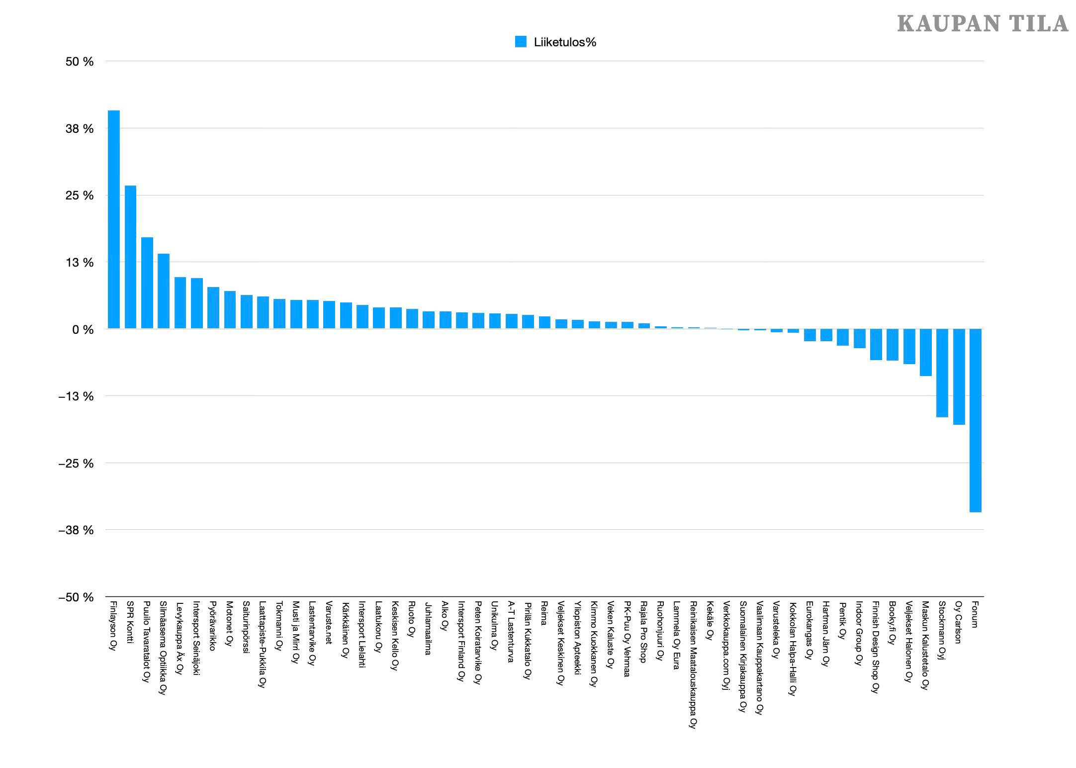 Tuloksen osalta erikoiskaupalla meni hieman paremmin. Peräti 39 ketjua raportoi positiivisen liiketuloksen. Toisaalta joillakin yrityksillä liikevaihto oli pahasti pakkasella.