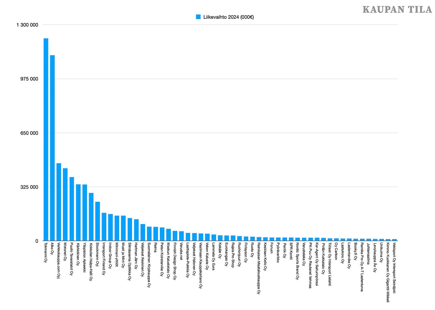 Näiden kahden suuren ketjun jälkeen ryhmä on tasaisempi. Muutaman yrityksen liikevaihto on yli 300 M€ ja vain 16 kotimaista erikoiskaupan yritystä pääsee yli 100 M€ liikevaihtoon. Kotimaisen erikoiskaupan yritykset ovat siis kokoluokaltaan hyvin pieniä.