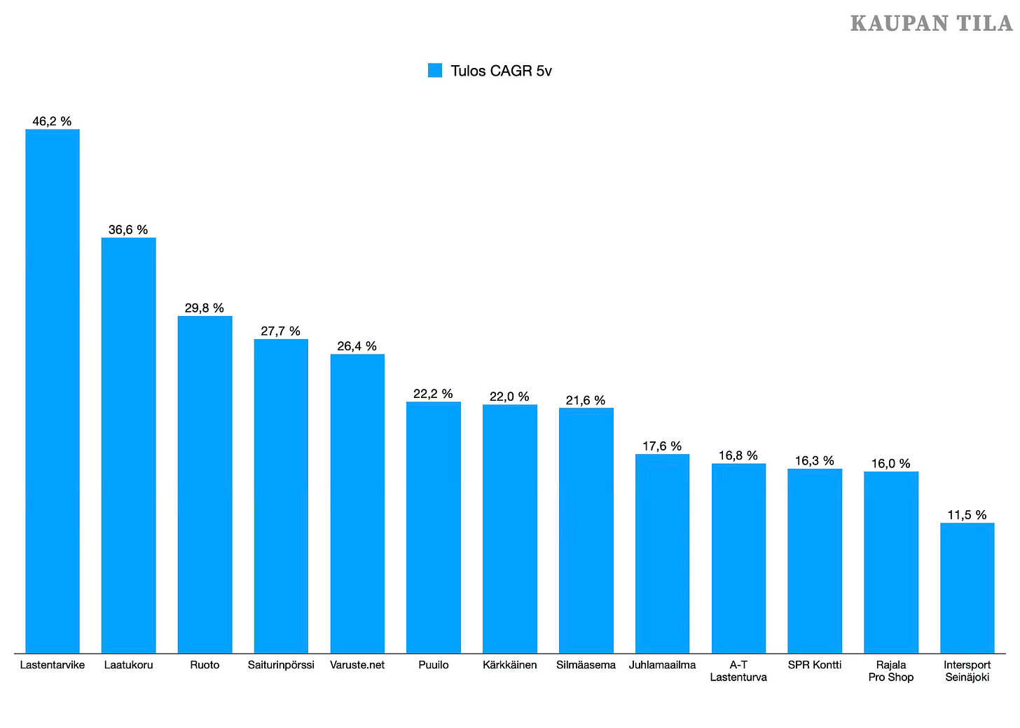 Kun katsotaan viimeisen viiden vuoden ajalta, peräti seitsemän ketjua on kyennyt kasvattamaan liikevaihtoaan keskimäärin yli 20 % vuodessa viiden vuoden ajan. Tuloksen kasvattamisessa vastaavaan 20 %:n keskimääräiseen vuosikasvuun ylsi kahdeksan erikoiskaupan ketjua.