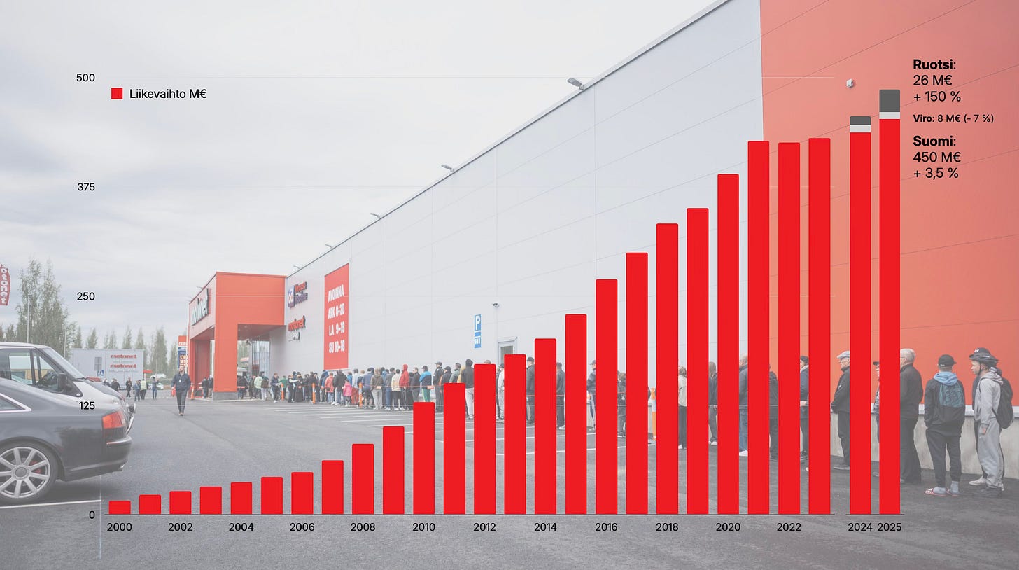 ”Nyt ollaan mukavassa kasvussa siinä, että keskiostos on kasvussa, volyymit ovat kasvussa ja asiakasmäärät ovat kasvussa. Lopputilikaudesta saatiin mukavasti kirittyä alkuvuoden heikompaa kehitystä. Koko tilikauden osalta pääsimme Suomessakin kasvun puolelle ja nyt oikeastaan sama vauhti on jatkunut. Ei olla siellä yksinumeroisten lukujen alkupäässä, vaan ollaan lähempänä kymmenen prosentin kasvua. Se on ihan positiivinen tilanne.”
