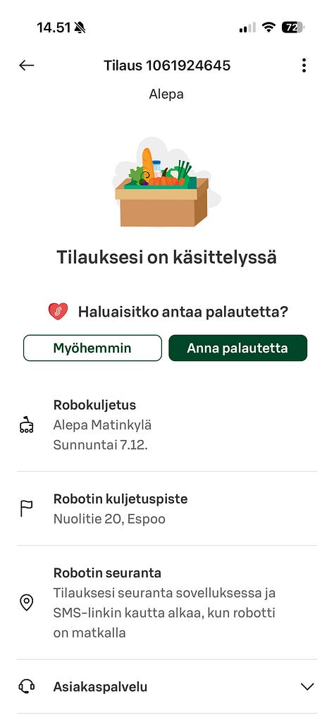 Kauppalehden aamun jutussa mainitaan, että tänä vuonna robotit ovat kuljettaneet 800 000 tilausta. Jos keskiostoksen oletetaan olevan 30-40 €, tuolla tilausmäärällä kokonaismyynti olisi 24-32 M€.