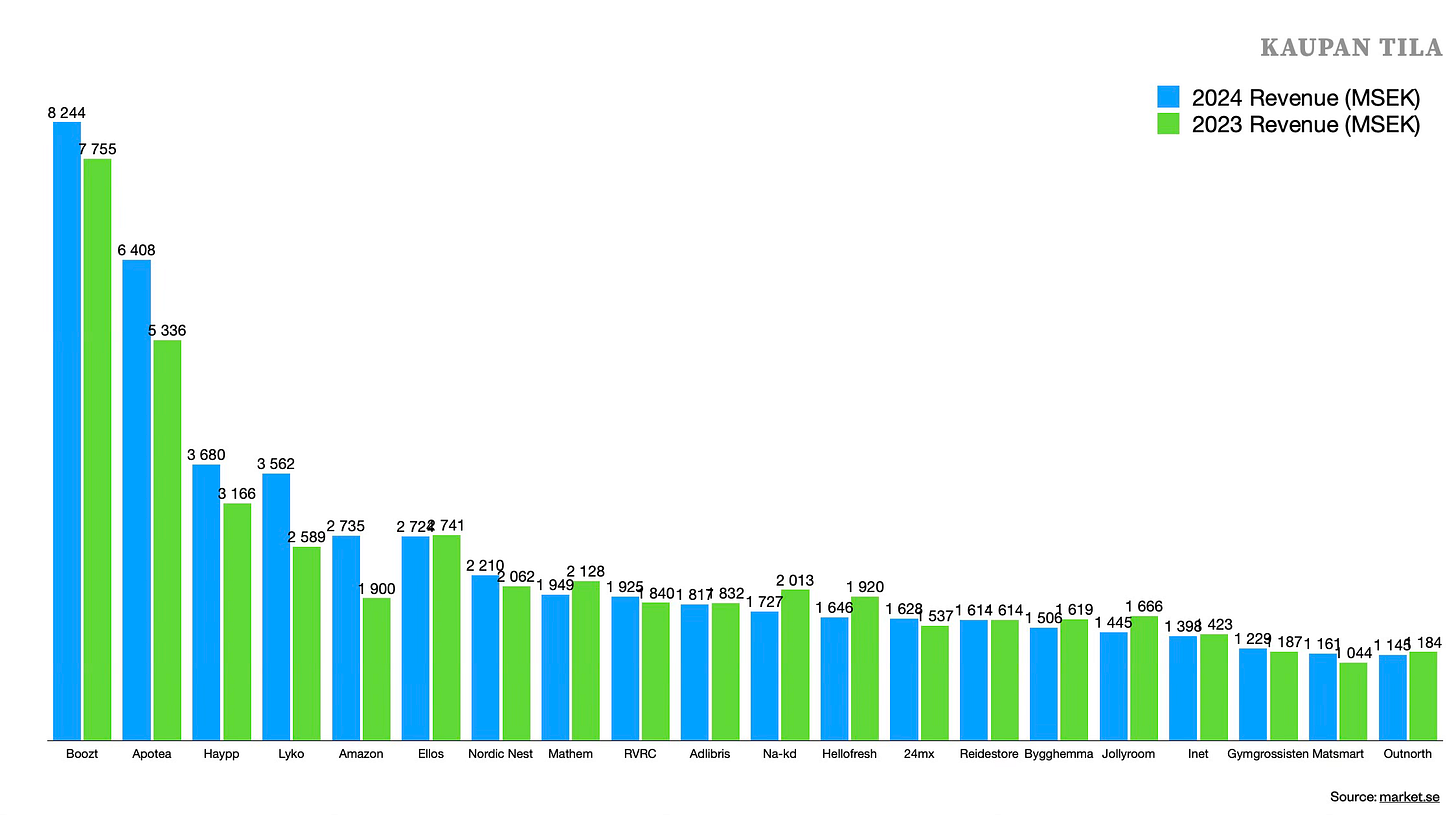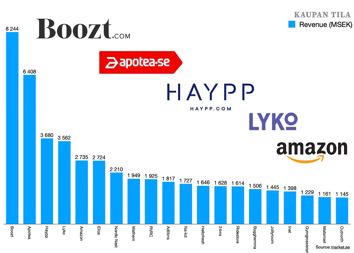 Ruotsin 20 suurimman verkkokaupan listaus jatkaa Booztin, Apotean ja Hayppin kommennossa. Kärkiyhtiöistä Booztin myynti kasvoi hitaimmin, +6,3 %. Suurin muutos suurten verkkokauppojen kärkiryhmässä oli Amazonin kovan kasvun jatkuminen.
