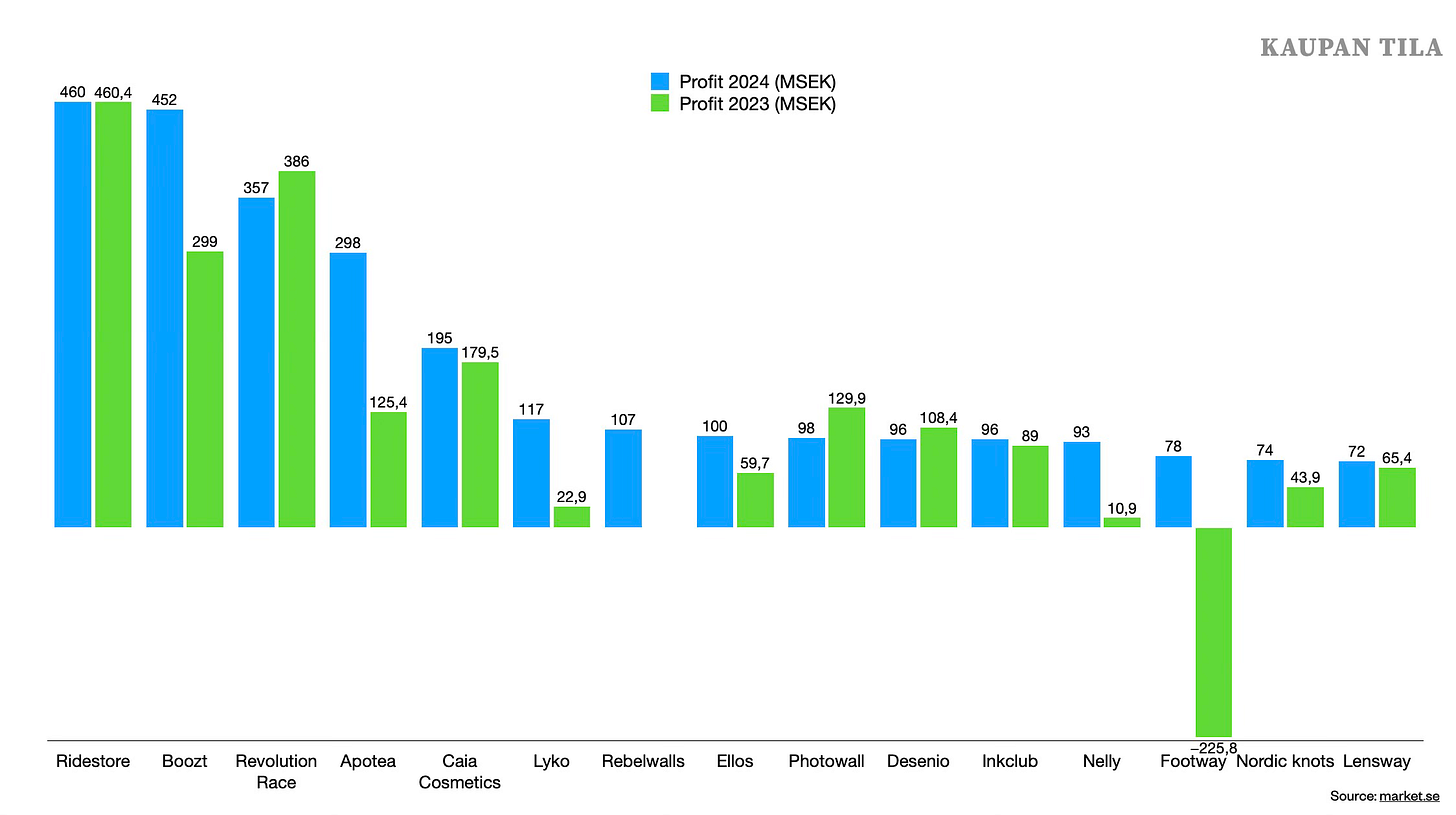 Kannattavuuden osalta lasketteluvaatteita valmistava Ridestore jatkaa eniten tulosta tekevänä verkkokauppana. Tämä siitä huolimatta, että yhtiö on myynnillä mitattuna vasta sijalla 14.