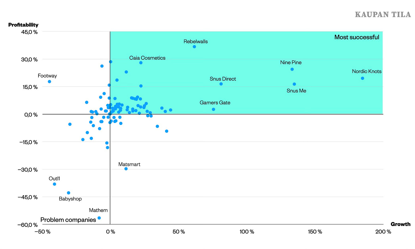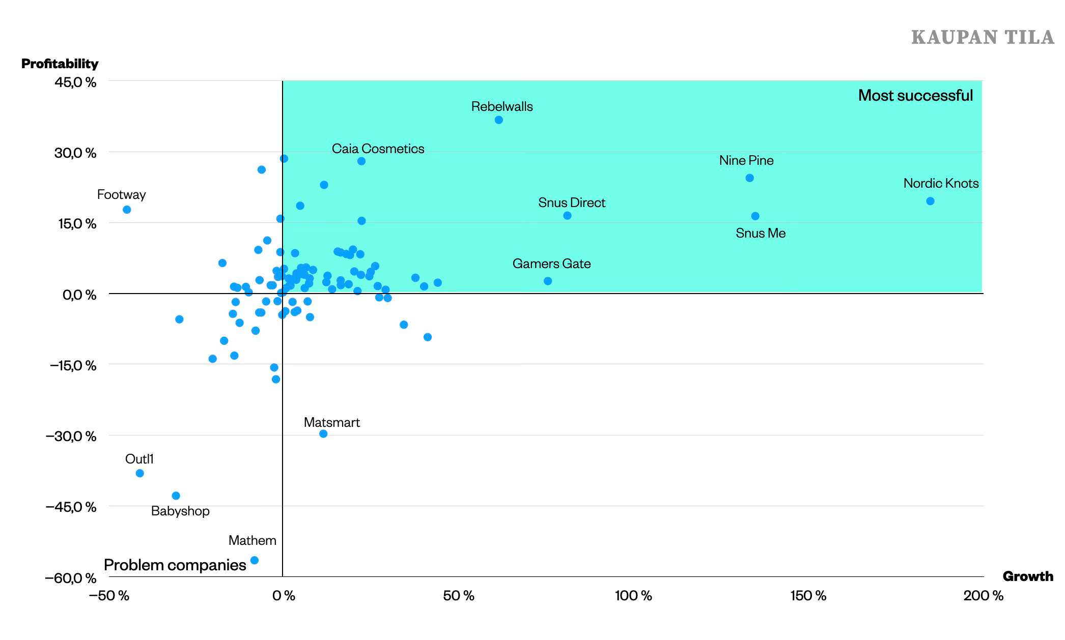 Tappiollista liiketoiminta oli viime vuonna 29 verkkokaupalla. Vuotta aiemmin tappiota teki vielä 36 verkkokauppaa. Kannattavuuden osalta peräti kuusi verkkokauppaa teki yli 20 % liiketulosta. Erittäin kova suoritus ottaen huomioon, että monet niistä kasvoivat kaksinumeroisin luvuin.