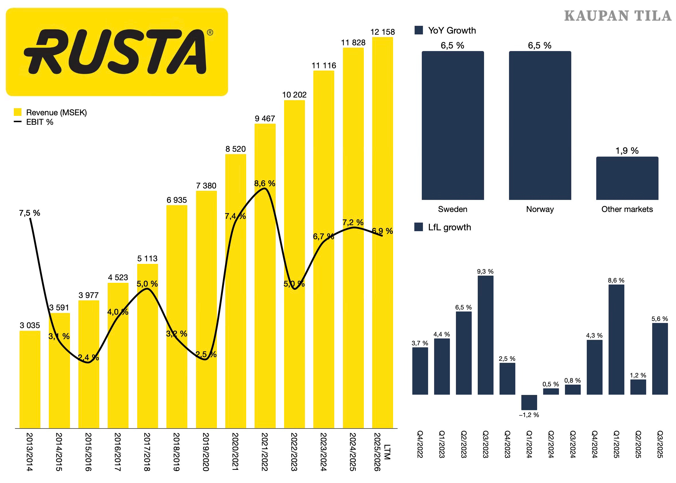 Muilla markkinoilla (Suomi, Saksa, verkkokauppa) kasvu jäi 1,9 %:iin. Ruotsi (59 %) ja Norja (21 %) vastaavat 80 % Rustan liikevaihdosta ja käytännössä kokonaan yhtiön tuloksesta.