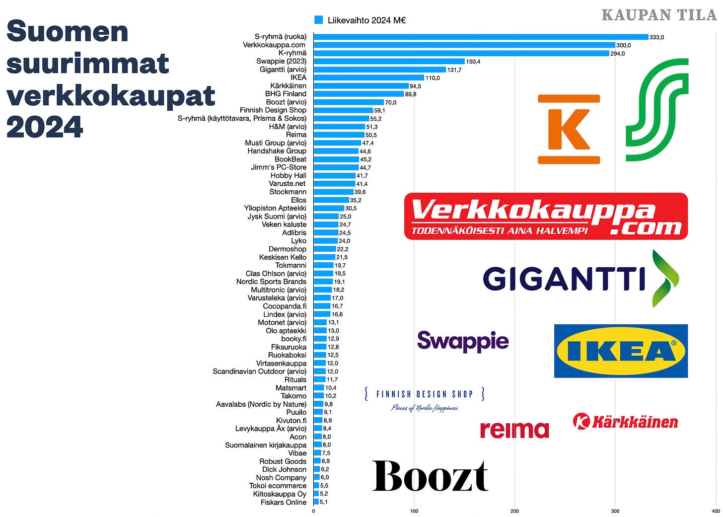 Oheisessa kuvassa on maamme suurimmista verkkokaupoista. Listalle mahtuu mukaan 55 verkkokauppaa, joiden kaikkien liikevaihto on enemmän kuin viisi miljoonaa euroa. Listalla on viisi ruokakaupan verkkokauppaa. Kahden suuren keskusliikkeen mukaan mahtuvat Ruokaboksi, Fiksuruoka sekä Matsmart.