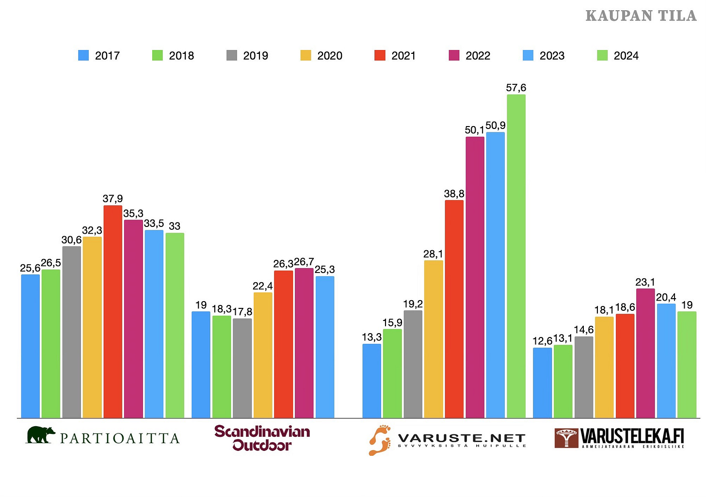 Koko markkinan poikkeuksena läpi vaikeiden vuosien on toiminut Varuste.net. Kevään artikkelissa käsiteltiin heidän hienoa kasvutarinaa, jota kansainvälistyminen vetänyt kotimaisen markkinan myllertäessä. Varuste.net on myös ainoa, jonka tulos on säilynyt korkealla tasolla.