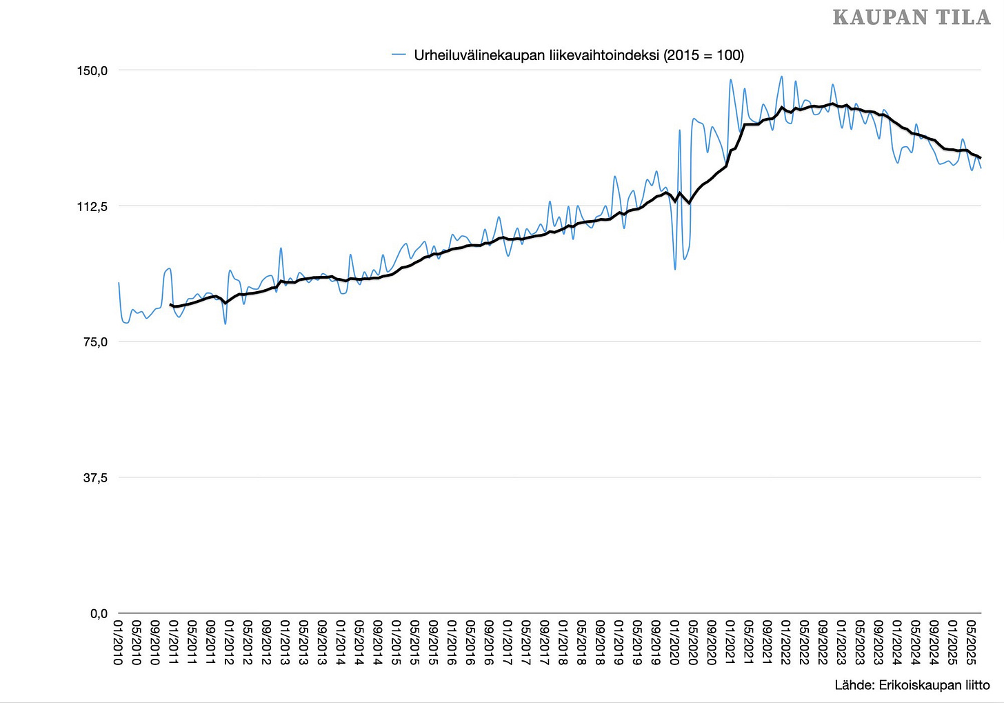 Urheilukaupan myynnin lasku ei ole ollut aivan yhtä voimakasta kuin esimerkiksi rautakaupan puolella. Siinä missä rautakaupassa myynnistä on haihtunut miltei 10 vuoden kehitys, urheiluvälineiden kaupassa myynti laski vain noin viiden vuoden taakse, pandemiaa edeltäneelle tasolle.