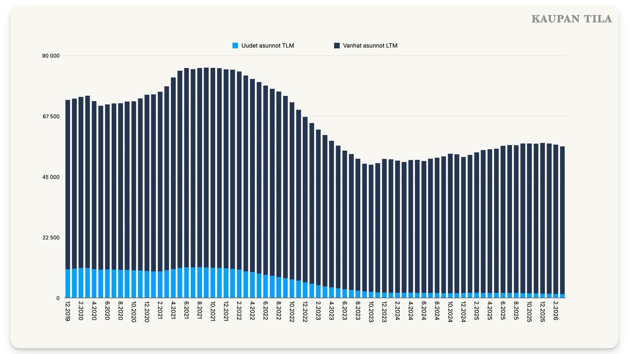 Toinen huolestuttava tilasto tulee asuntokaupan puolelta. Vanhojen asuntojen kauppamäärät ovat kääntyneet tänä vuonna laskuun, vaikka merkkejä paremmasta on ollut pitkään. Asuntokaupan kehitys heijastuu herkästi kodin tuotteiden kauppaan.