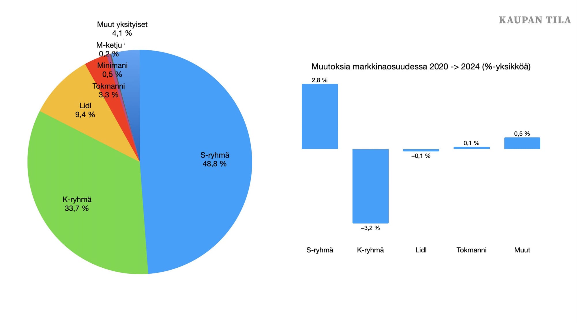 Siinä missä vuosina 2019 ja 2020 K-ryhmä onnistui kasvattamaan markkinaosuuttaan S-ryhmää nopeammin, on S-ryhmä ottanut ”vahingon” takaisin korkojen kera. Vuosien 2020-2024 aikana S-ryhmän markkinaosuus on kasvanut jo ennestään vahvalta tasolta peräti 48,8 %:iin. Tällä kehityskululla S-ryhmä alkaa hätyytellä 50 % markkinaosuutta lähivuosina. Maailmassa ei liene ruotsalaisen ICA:n ohella toista kauppaketjua, joka olisi onnistunut 50 % markkinaosuuden rikkomisessa.